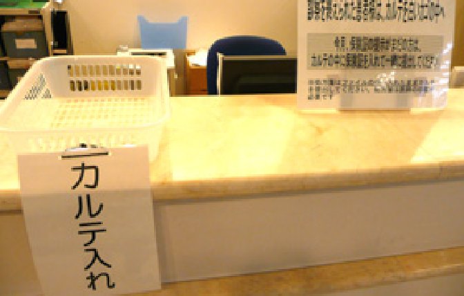 • 2 記入が終わりましたら、保険証と一緒にファイルに入れて、カウンターの上に置いてあるカゴの中に入れて、総合受付前の椅子にかけてお待ちください。